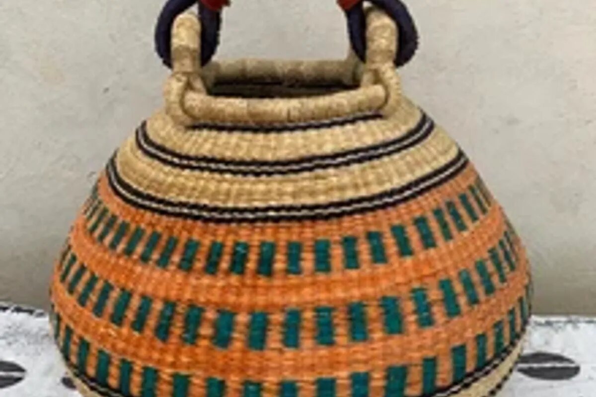 Our Bolga Bags/Baskets are made from elephant grass. Our Baskets are made in Bolgatanga in the upper east region of Ghana. This Beautiful basket and many of our baskets are made by women and children in villages in Bolga. Our baskets are 100% handmade and also biodegradable.